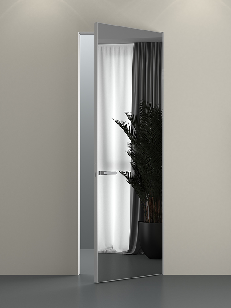 Дверное полотно изготавливается из массива сосны и панели МДФ, на которую наносится грунтовка с одной стороны полотна для дальнейшей финишной отделки, с другой вклеивается зеркало. Алюминиевая кромка может быть матовой или черной. Толщина полотна по кромке - 43 мм.