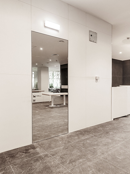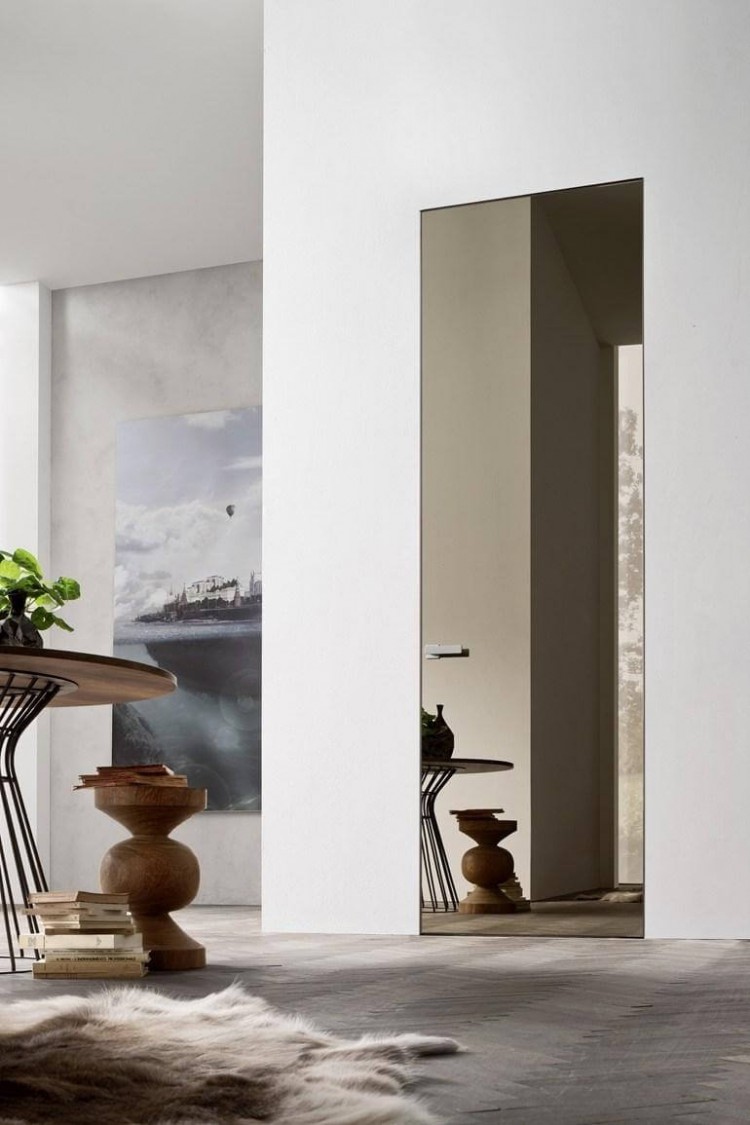 Дверь устанавливается в алюминиевый короб, который монтируется внутри дверного проема, вровень с плоскостью стены. При этом короб не оформляется наличниками, что позволяет создать эффект невидимой двери.